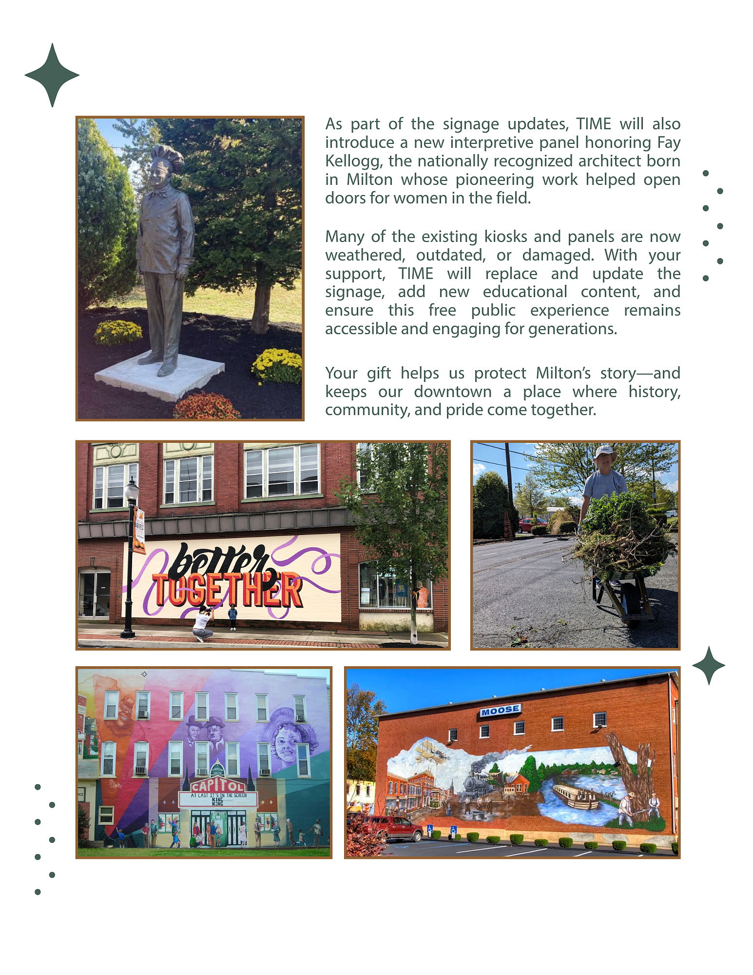 The Improved Milton Experience (TIME) is a vibrant nonprofit dedicated to the revitalization and economic development of downtown Milton, PA. Our mission is to serve as a dynamic catalyst for community pride by celebrating the best of Milton’s past, present, and future. We envision a clean, safe, historically significant, and architecturally interesting community, and we are committed to engaging residents, businesses, and partners to bring that vision to life. Through our programs and initiatives, TIME works to strengthen Milton’s identity, support local vitality, and create a welcoming environment for all.