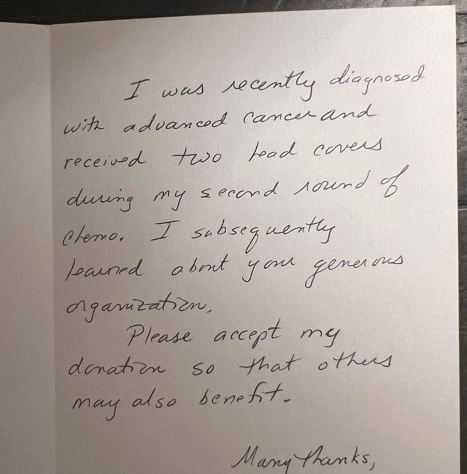 Paying it Forward: "I was recently diagnosed with advanced cancer and received two headcovers during my second round of chemo. I subsequently learned about your generous organization. Please accept my donation so that others may benefit."