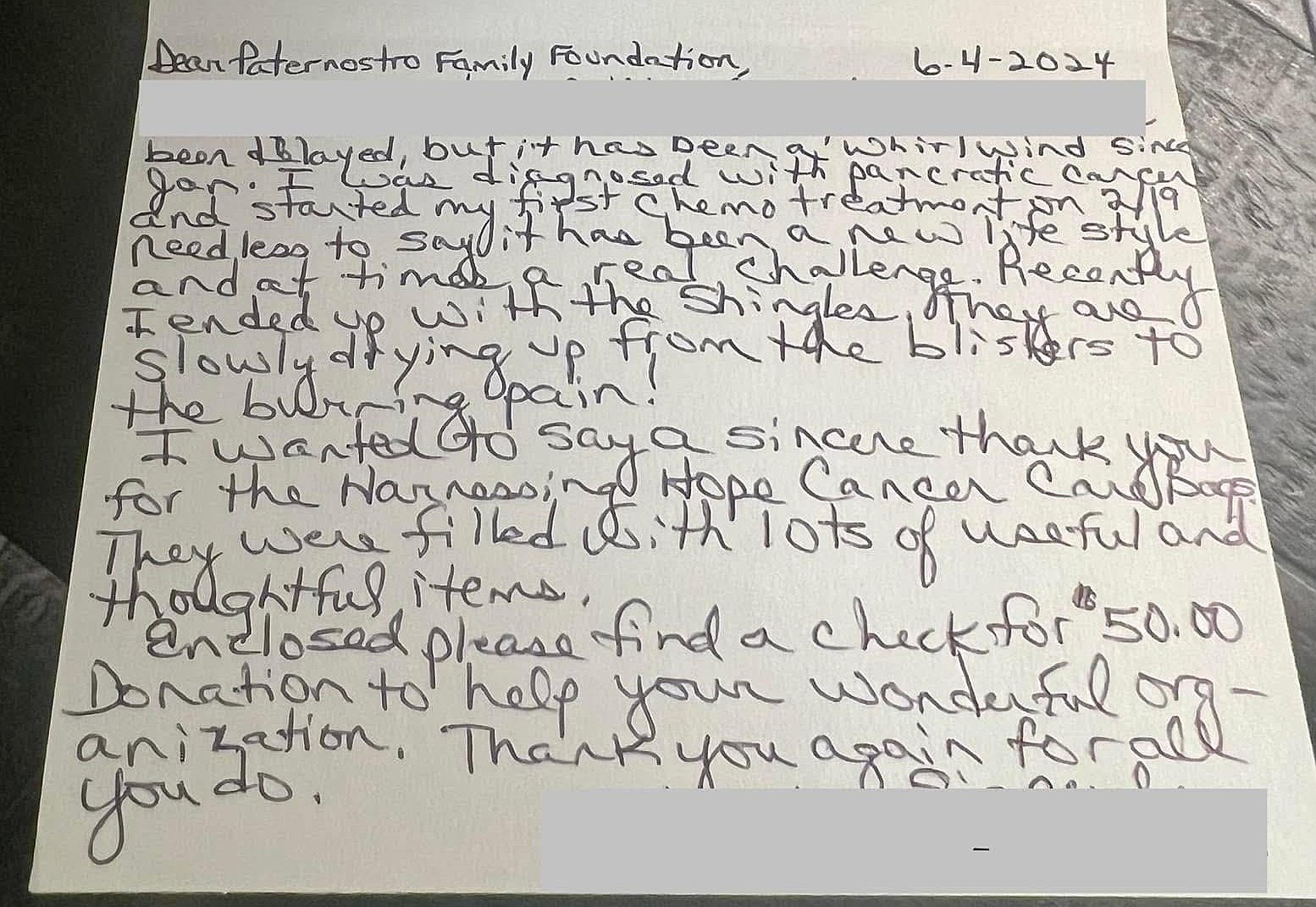 Making a Difference: "I wanted to say a sincere thank you for the Harnessing Hope Cancer Care bags. They were filled with lots of useful and thoughtful items. Enclosed please find a check for $50.00 donation to help your wonderful organization."